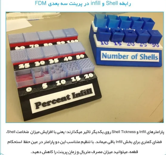ضریب «اینفیل» بصورت درصد تعریف میشود و به معنی میزان پرشدگی یا جامدسازی قسمت درونی مدل است. طراحان مدل سه بعدی معمولا این ویژگی را در طراحی به سلیقه خود تعریف میکنند و هنگام پرینت سه بعدی باید حتما آنرا بررسی و اندازه مناسب تعیین گردد؛ این امر بسته به فرم هندسی مدل، کاربری مدل (مکانیکی بودن با در معرض فشار قرار داشتن) متفاوت است. بنابراین در برخی قطعات، مقدار آنرا بالا در نظر بگیرید. در موارد معمول، میزان ۲۰ تا ۳۰ درصد برای Fill Density کاملا مناسب است.