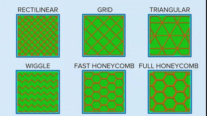 از این ویژگی برای تعیین الگوی بافت چاپ لایه های بخش درونی مدل استفاده میگردد. به طور معمول الگوی honeycomb کاربرد زیادی دارد. به صورت پیش فرض نیز در نرم افزارهای پرینتر سه بعدی نیز همین گزینه فعال است. در عکس زیر انواع الگوهای بافت بیرونی لایه داخلی مدل را مشاهده میکنید: