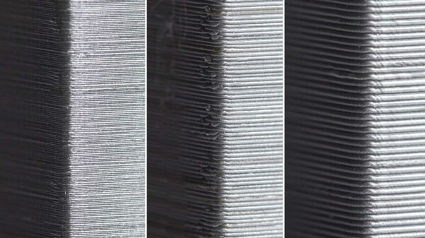 در عکس زیر تفاوت Layer Height را از چپ به راست (عالی به بد) مشاهده میکنید. هر چه به طرف راست میرویم، رگه شدن لایه ها بیشتر مشهود است: