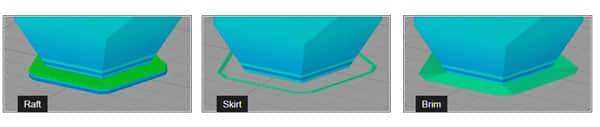 در فرآیند پرینت سه بعدی دو نوع ساختار مرسوم «چسبندگی کف» وجود دارد: لایه Raft و لایه Brim. این دو لایه برای اطمینان از چسبندگی لایه اول چاپ در مدل به کار میروند.