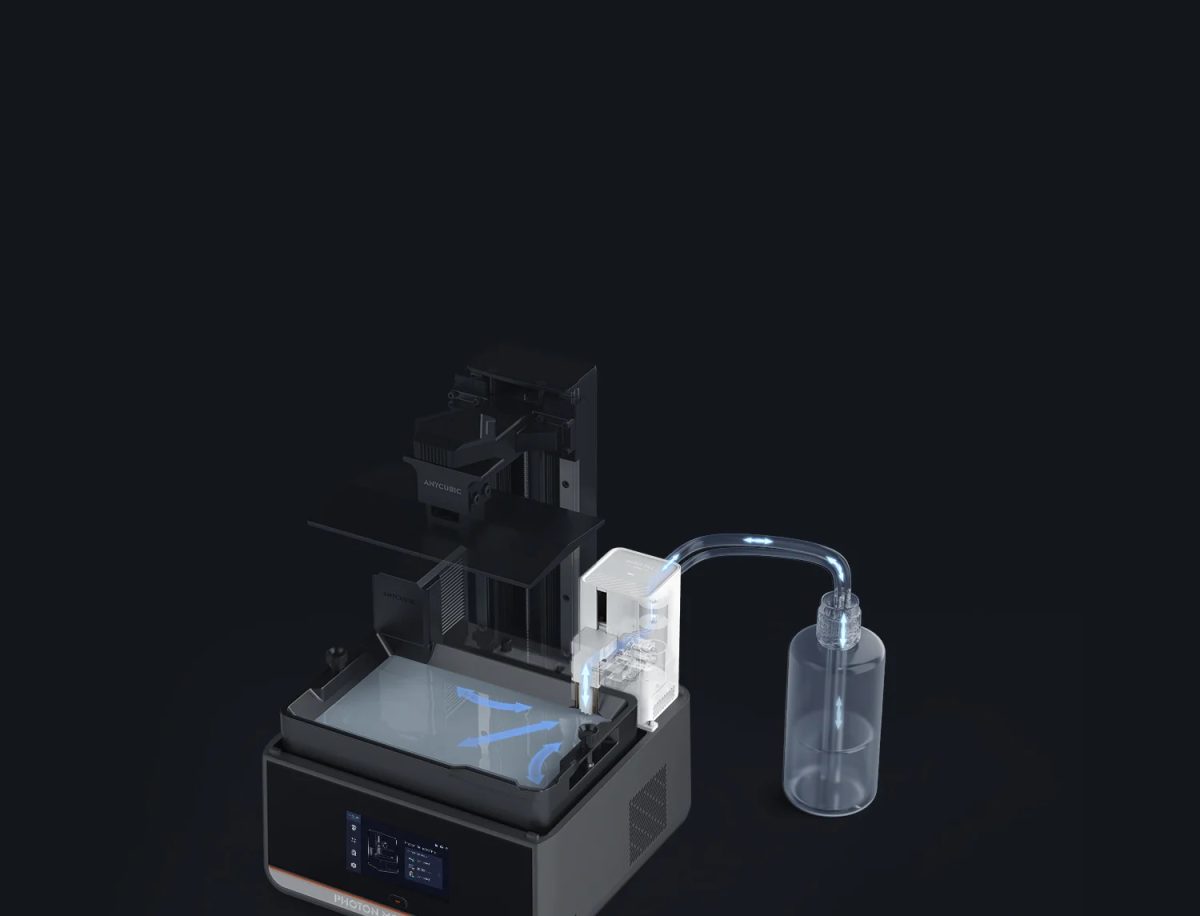 به منظور سادهسازی حداکثری کار با رزین ، پرینتر سه بعدی رزینی 14K مدل Anycubic photon mono M7 Pro دارای مکانیزم خودکاری برای تامین رزین جهت پرینت و همچنین در حین پرینت و یا پمپاژ آن بعد از اتمام پروسه پرینت است. به لطف این سیستم خودکار، رزین مورد نیاز جهت پرینت به طور مداوم در طول فرآیند پرینت تامین میشود. همچنین بعد از اتمام پروسه پرینت، رزین باقیمانده با فشار یک دکمه پمپاژ شده و برای استفاده مجدد بازیافت میشود. بدین ترتیب زمان تمیزکاری دستگاه کمتر شده و باعث صرفهجویی در هزینهها نیز میشود