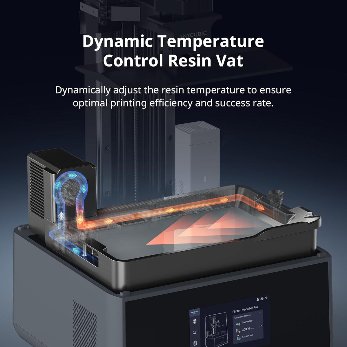 پرینتر سه بعدی رزینی 14K مدل Anycubic photon mono M7 Pro مجهز به مخزن رزین و یا تانک رزین با کنترل دمای دینامیک دارای یک پمپ پریستالتیک، یک بخاری و یک کانال گردش خاص است که رزین را در مخزن به طور پیوسته گردش داده و در دمای بهینه نگه می دارد. این سیستم با توجه به نیاز کاربر، رزین مصرفی را گرم و یا سرد می کند و در حالت پیش فرض، دمای بهینه ۲۵ درجه سانتیگراد برای آن در نظر گرفته شده است. با استفاده از این سیستم، دمای رزین در مدت زمان 20 دقیقه از 5 درجه سانتیگراد به 25 درجه سانتیگراد افزایش می یابد. در این سیستم، ، دمای واقعی رزین قبل از پرینت توسط یک سنسور خودکار اندازهگیری میشود تا بتوان آن را بر اساس نیازهای چاپ تنظیم کرد. همچنین دمای رزین در حال گردش نیز در طول فرآیند پرینت به طور مداوم کنترل میشود. مجهز بودن یک پرینتر به این سیستم امکان پرینت انواع مختلف رزین با سطوح ویسکوزیته متفاوت را فراهم می کند
